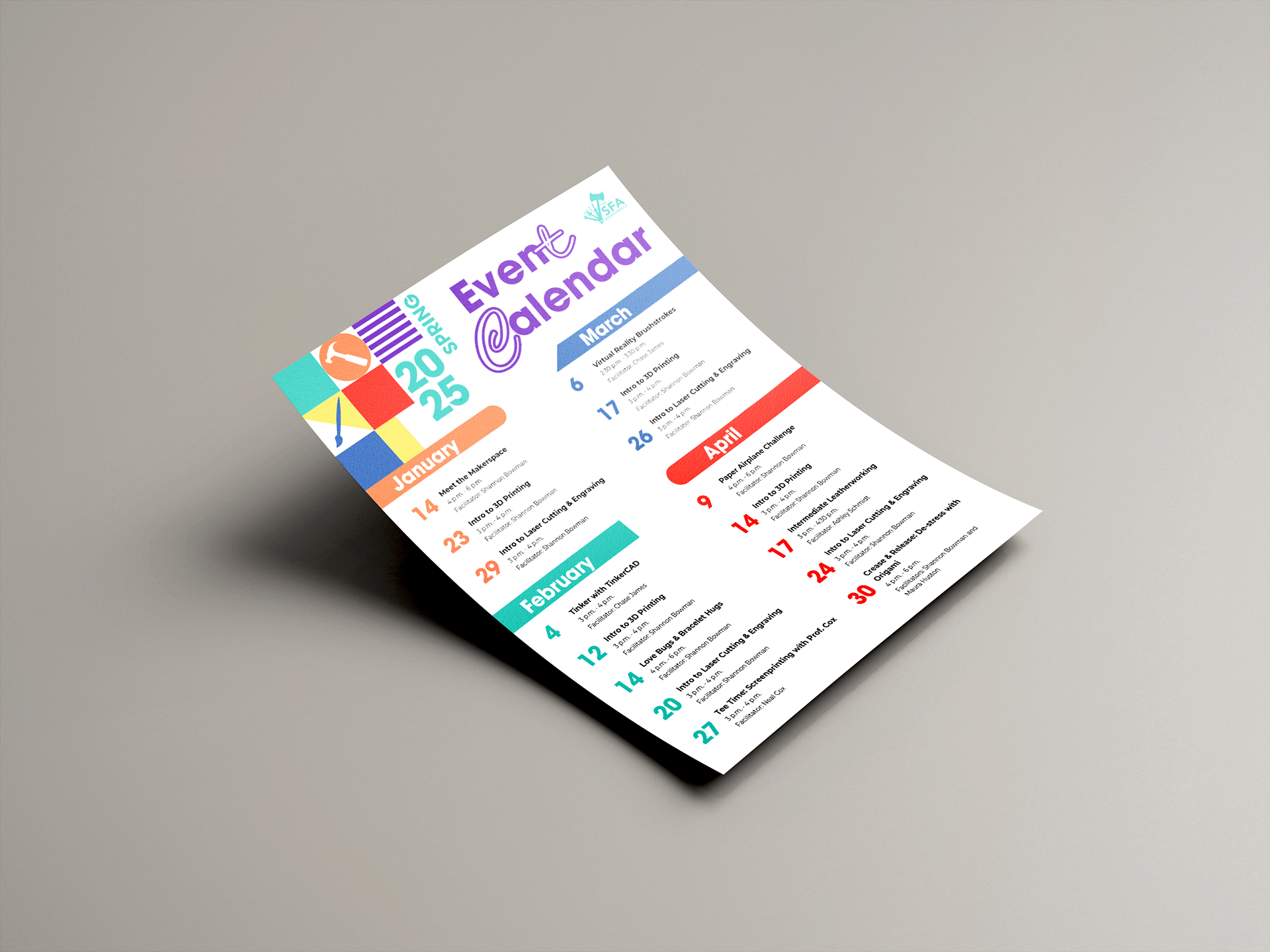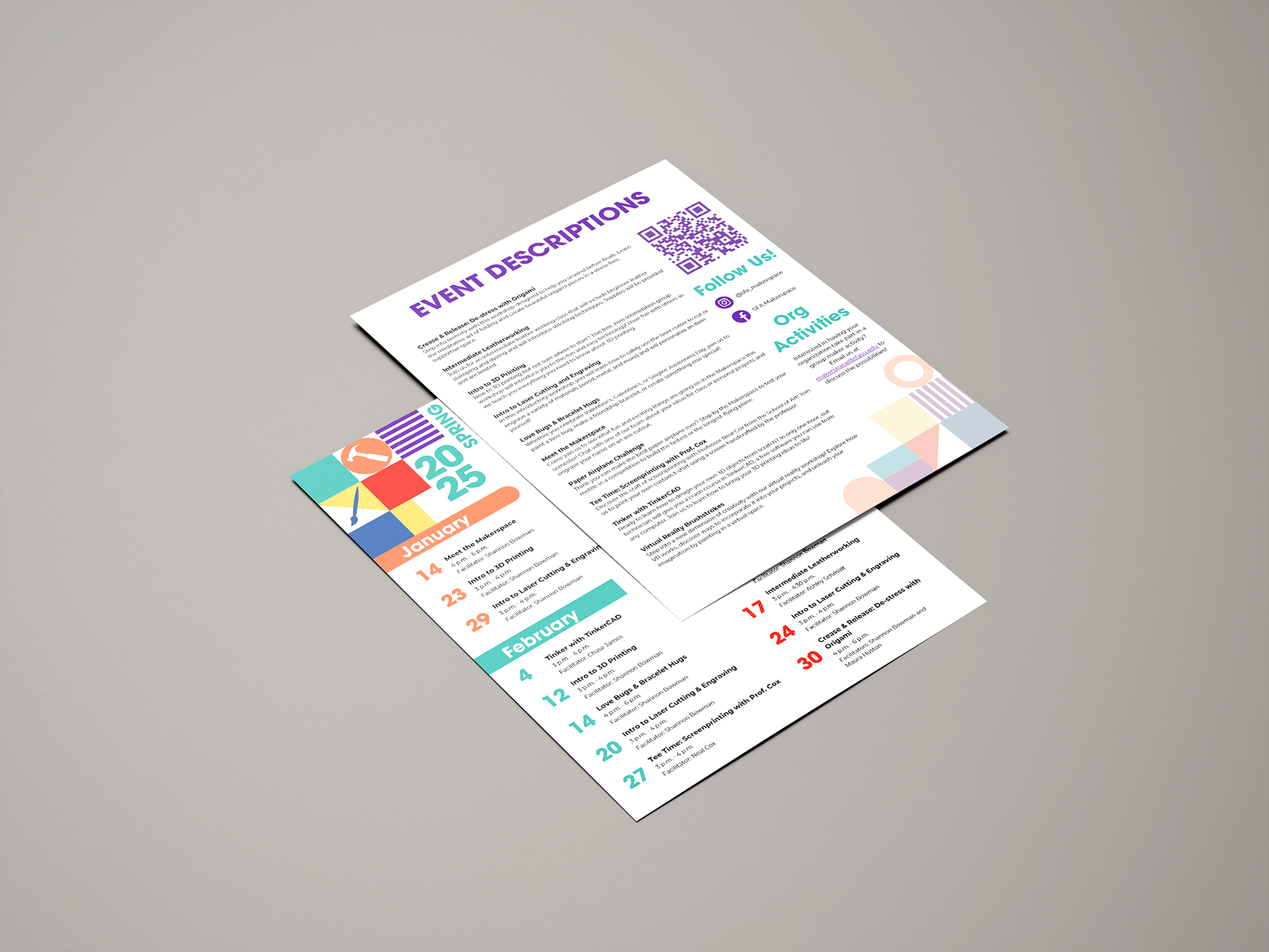 As part of my duties as the Makerspace graphic designer, I made an event calendar each semester outlining the many workshops/events available to students throughout each month. This semester's calendar was made in Canva, with the goal of communicating the information clearly while keeping the brand-standard pattern and color palette.